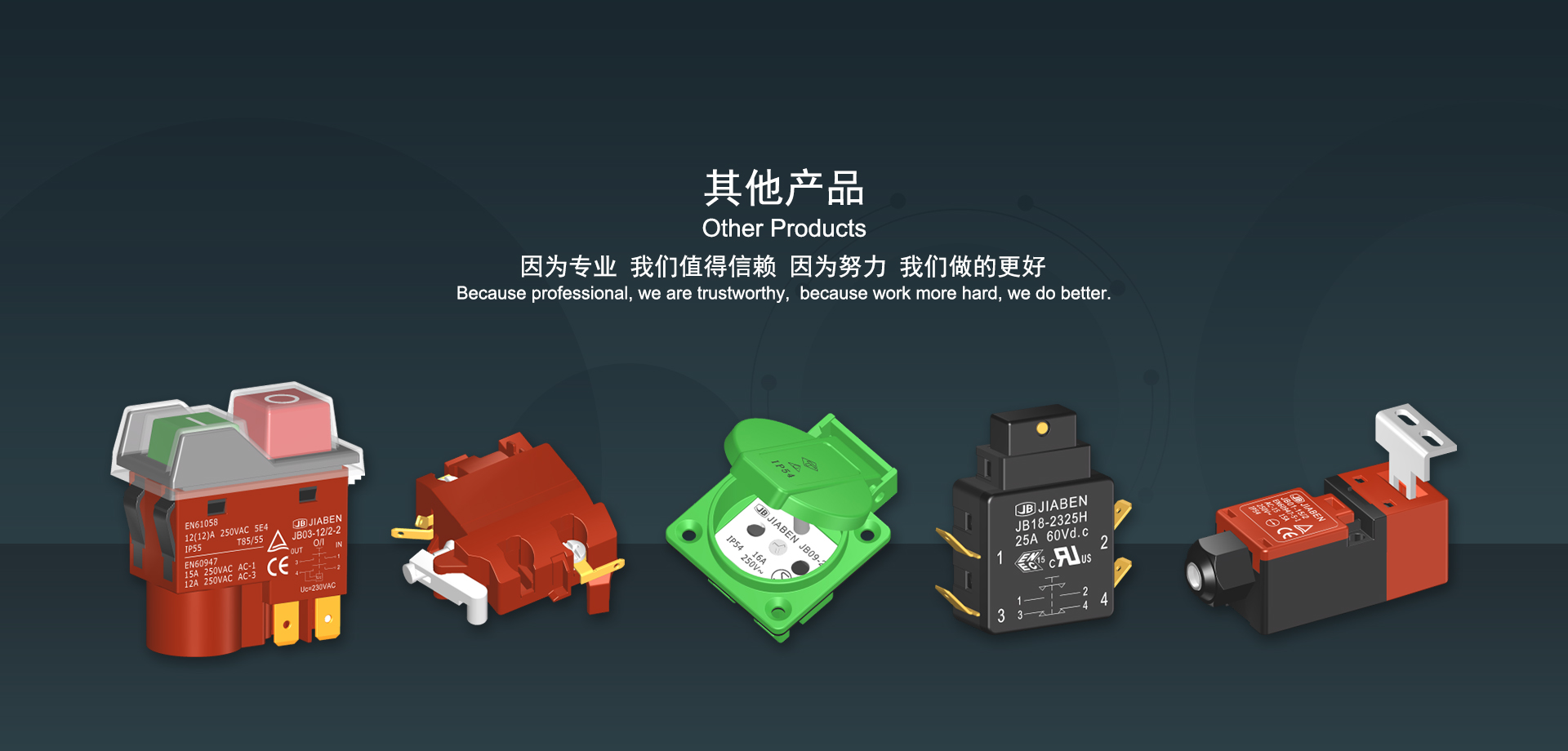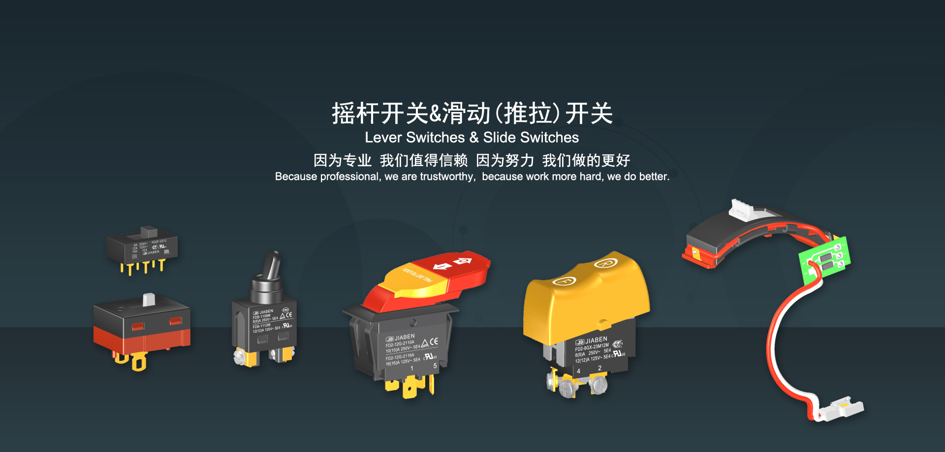 浙江佳奔電子有限公司始建于1986年,坐落于浙江省樂清市虹橋鎮東電子信息產業園內,現有職工700多人,資產總額超3億元。公司主要經營“JIABEN”牌微動開關、蹺板開關、按鈕開關、扳機開關、調速開關和電位器開關等各類交、直流器具開關和各類交、直流線路板模塊等產品,主要應用于交、直流電動工具、電動園林工具、清潔器具、家用電器和小型機床等行業,是集產品設計、研發(fā)、制造、銷售和服務于一體的國家高新技術企業。JIABEN was founded in 1986, located in East Electronic Information Industry Park, Hongqiao Town, Yueqing City, Zhejiang Proviance, existing staff more than 700 peoples, more than 300 million RMB worth of assets. Company is mainly engaged in "JIABEN" brand Micro Switch, Rocker Switch, Push-button Switch, Trigger Switch, Speed Regulating Switch, Potentiometer Switch and other kinds of appliance switch and all kinds of AC or DC circuit board module, such as more than 100 series, 8000 kinds of models of products, mainly used in AC or DC Power-tools, Power Gardening Tools, Cleaning Appliances, Household Appliances and Small Machine Tool and other industries, is the collection product design, research and development, manufacturing, sales and service in one of the national high and new technology enterprise.